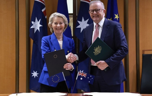 Європейський Союз та Австралія у вівторок, 24 березня, завершили переговори щодо угоди про вільну торгівлю, які розпочалися у 2018 році. Про це повідомила пресслужба Єврокомісії. Очікується, що експорт ЄС зросте до 33% протягом наступного десятиліття, а вартість експорту сягне 17,7 мільярда євро щорічно. Ключові сектори з високим потенціалом зростання включають молочну продукцію (очікується збільшення до 48%), автомобілі (52%) та хімічну продукцію (20%). Інвестиції ЄС в Австралію мають потенціал зрости понад 87%. Зазначається, що завдяки цій угоді Євросоюз також зміцнює свої стратегічні інтереси в галузі критично важливої сировини, роблячи ланцюги поставок ЄС сильнішими та стійкішими до геополітичних потрясінь.