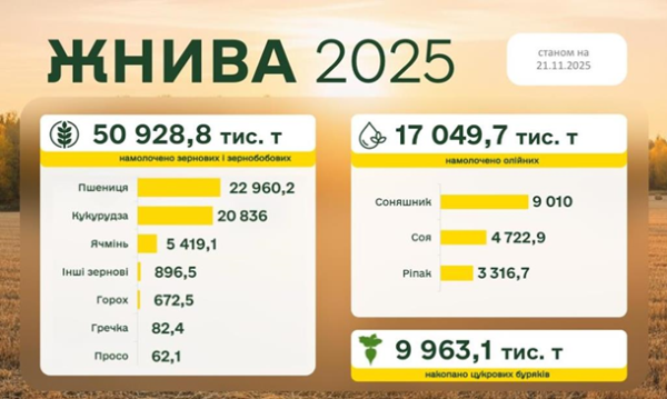 Також повідомлялося, що українські аграрії станом на 24 жовтня намолотили 37,560 млн тонн зернових та зернобобових культур з 8,400 млн га, що складає 73% площ, засіяних цими культурами.Україна у жовтні експортувала 4,5 млн тонн агропродукції, що на 20,8% більше аналогічного показника попереднього місяця.